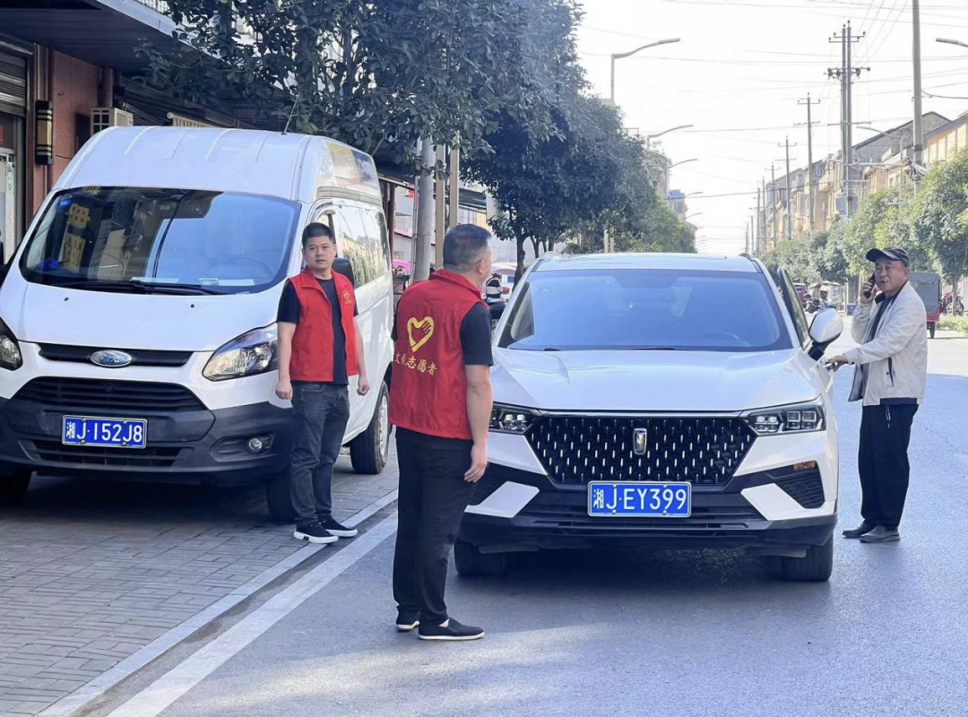 支部黨員在轄區(qū)主干道勸導違停車輛